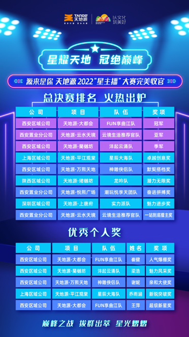 根据领导评审团和媒体评审团的现场打分以及复赛排位赛的线上得分,天地源·大都会FUN享曲江队以较高的专业素养和稳健的现场反应,赢得了大家的一致好评,摘得本次大赛的冠军,天地源·云水天境云境生活推荐官队、天地源·蘭樾坊沣起云涌队则分别荣登亚、季军的宝座。现场评选出优秀个人奖五名,分别是天地源·大都会FUN享曲江队崔健、天地源·蘭樾坊沣起云涌队梁浩、天地源·万熙天地神雕侠侣队谢妮、天地源·平江观棠星辰大海队乔雨涵、天地源·大都会FUN享曲江队王萍。