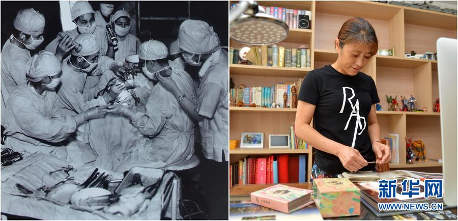 拼版照片:左图为唐山大地震发生后,上海医疗队在给伤员做手术(资料照片);右图为7月24日,“地震婴儿”孙沪在家中整理老照片(新华社记者牟宇摄)。