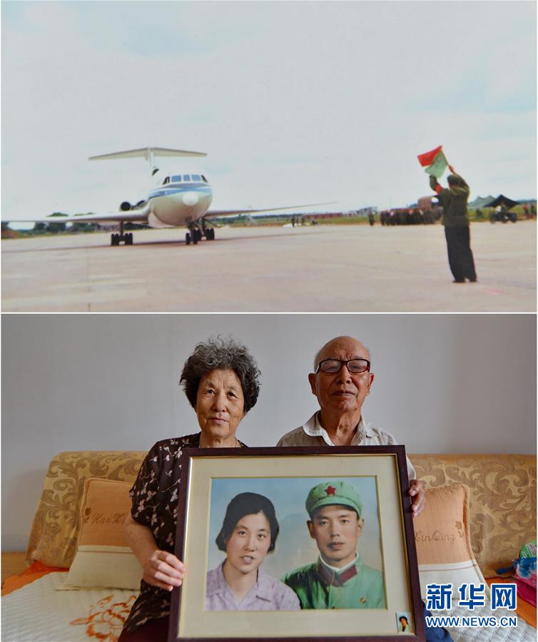 拼版照片:上图为唐山大地震发生后,李升堂在机场指挥飞机降落(资料照片);下图为7月23日,李升堂夫妇在家中合影(新华社记者牟宇摄)。