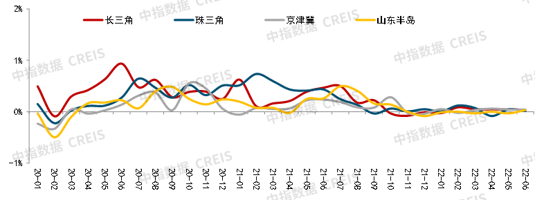 百城二手住宅方面,根据中国房地产指数系统百城价格指数,2022年上半年百城二手住宅价格累计上涨0.17%,较2021年上半年收窄2.39个百分点,较2021年下半年亦有所收窄。受多地疫情反复冲击,市场信心有所走弱,5月、6月价格环比再次下跌,但跌幅有限,房价整体呈横盘态势。