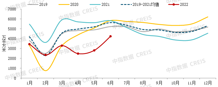 上半年重点城市供应端明显走弱,新批上市面积同比降幅超四成,6月房企推盘意愿提升。2022年上半年,受购房者观望情绪浓厚、疫情管控和市场销售低迷等因素影响,房企推盘积极性不足,供应节奏明显放缓。据初步统计,2022年上半年,重点50城商品住宅月均新批上市面积1675万平方米,同比下降44%,与2019-2021年同期均值相比下降39%,较2019年同期亦下降39%。6月,企业推盘节奏有所加快,50个代表城市商品住宅月均供应规模同比下降近四成,降幅较5月收窄约10个百分点,环比增长42%,市场供应端有所修复。
