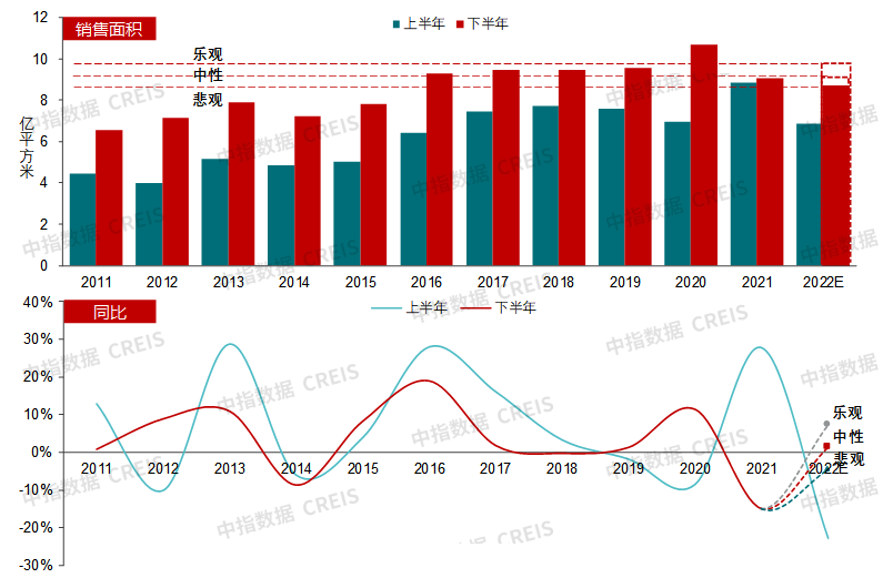 图:2011年以来全国商品房半年度销售面积及同比增速(乐观、中性和悲观情形)