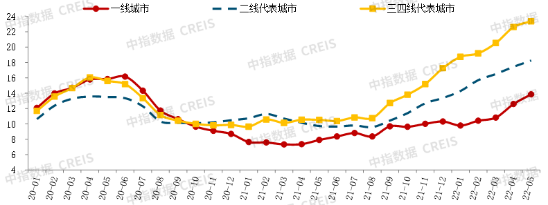 分梯队来看,截至2022年5月底,按近6个月月均销售面积计算,一线城市短期库存出清周期13.9个月;二线代表城市出清周期18.3个月,较2021年末延长4.9个月,短期库存面临一定压力;三四线代表城市出清周期23.4个月,较2021年末延长6.1个月,市场库存去化压力较大。