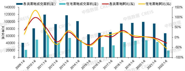 图:2009年以来上半年全国300城各类用地和住宅用地成交面积
