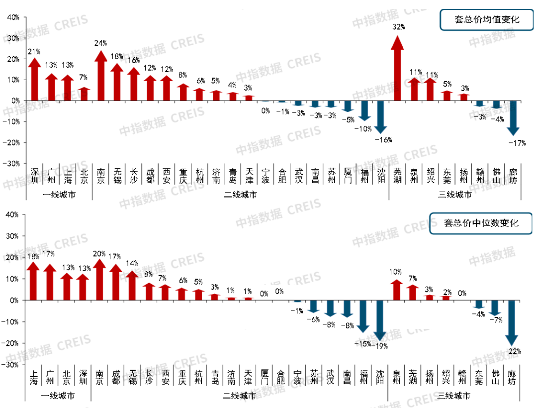 受此影响,30个代表城市中超半数城市平均套总价延续上涨趋势,深圳、南京、无锡、芜湖等城市成交套总价均值及中位数涨幅较为突出,沈阳、福州、苏州、廊坊、佛山等城市楼盘成交套总价均值与中位数均较2021年有所下跌。