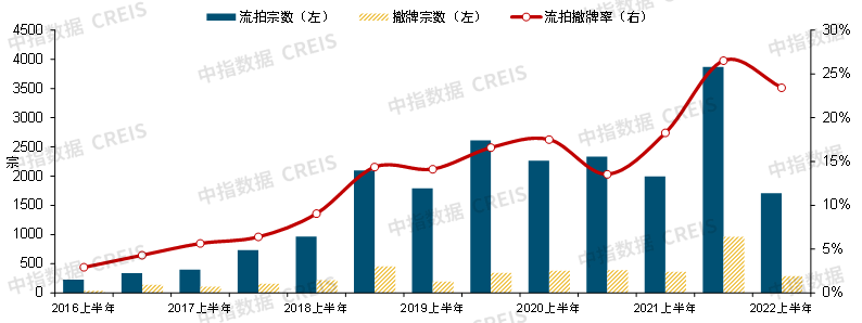 图:2016-2022年半年度全国住宅用地流拍和撤牌情况