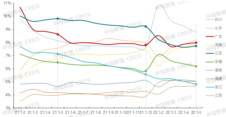 重点城市短期库存稳定在相对高位,出清周期有所延长。截至5月末,50个代表城市商品住宅可售面积处于2017年以来的相对高位,按近12个月月均销售面积计算,短期库存出清周期为15.3个月,较2021年末延长3.3个月;若按近6个月月均销售面积计算,短期库存出清周期为18.9个月,较2021年末延长5.0个月。