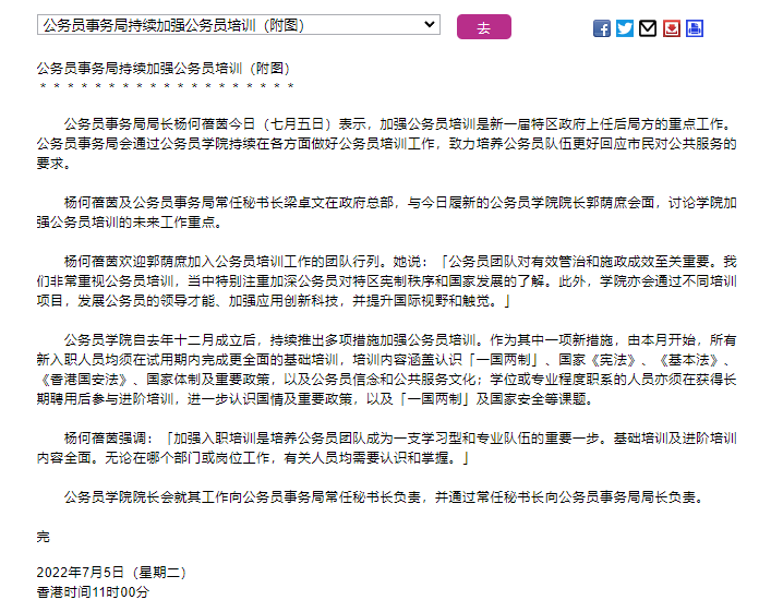 据香港特区政府新闻公报,香港公务员事务局局长杨何蓓茵7月5日表示,加强公务员培训是新一届特区政府上任后局方的重点工作。公务员事务局会通过公务员学院持续在各方面做好公务员培训工作,致力培养公务员队伍更好回应市民对公共服务的要求。