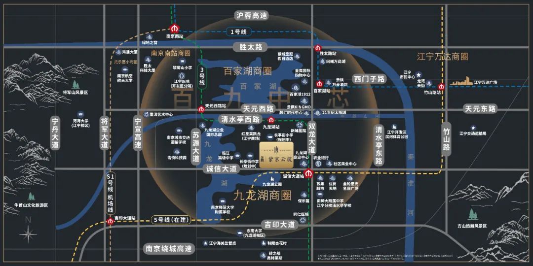 项目附近有长亭街初中和小学(规划中)、清水亭学校、南师附中江宁分校等众多学校,而且周边更有东南大学九龙湖校区、南京航空航天大学等高校环伺,人文氛围浓厚。