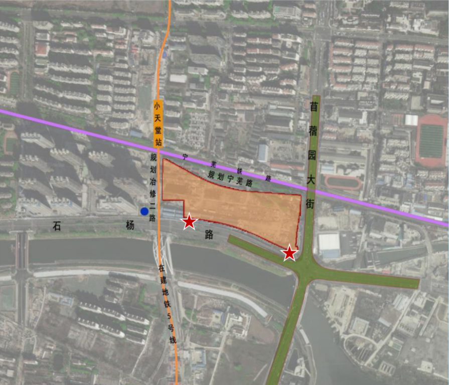 根据规划,项目拟建11栋26-30F住宅,其功能为二类住宅用地,住宅用地西南角为规划幼儿园用地,地块东侧现状为苜蓿园大街高架,南侧现状为石杨路高架,西侧相隔规划冶修二路有一处现状雨水泵站,北侧现状为宁芜铁路,远期规划为地铁8号线,地块西侧为在建地铁5号线,总用地面积52168.11㎡。