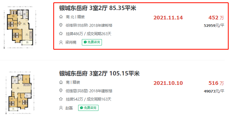 至于二手房市场,目前板块内的品质新房是银城东岳府,该小区挂牌均价约53463元/㎡,最新成交均价约5.3万/㎡,是去年11月成交一套面积约85㎡三室两厅。但目前区域内新房均价约4.7/㎡左右,算上精装包大概在5万/㎡出头,一二手房市场并无明显倒挂。