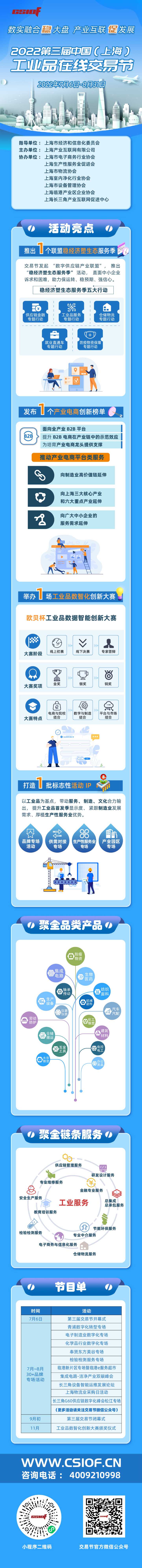 7月6日上午,2022第三届中国(上海)工业品在线交易节在上海国际会议中心开幕。界面新闻从开幕式上获悉,2022第三届中国(上海)工业品在线交易节于7月6日至8月31日举办。本届交易节以“数实融合稳大盘 产业互联促发展”为主题,紧贴常态化疫情防控下企业生产的实际需求,赋能中小企业、激发市场活力、普惠银企信贷,挖掘产业新赛道,激发工业新动能;将通过多层次、多场景的企业数字化服务体系,提供线上线下深度融合的场景服务,产业链全方位赋能,重构数字化生态圈,推动制造业供应链数字化协同发展。