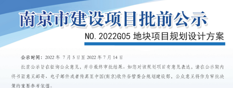 7月5日,中国(南京)软件谷官网公示了软件谷G05地块规划,根据规划显示,项目将拟建7栋32F高层住宅。