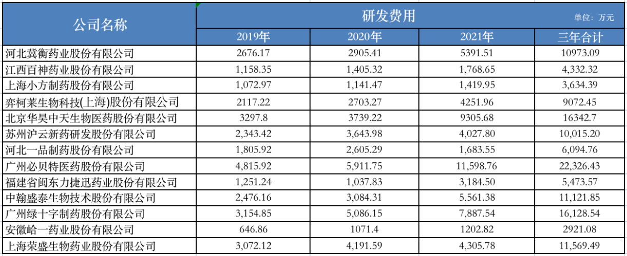 界面新闻梳理发现,13家企业中,必贝特研发费用最高,2019年至2021年研发费用分别为4815.92万元、5911.75万元、11598.76万元,三年合计达2.23亿元,其次为广州绿十字制药股份有限公司、上海荣盛生物药业股份有限公司,研发费用三年合计分别为1.61亿元、1.16亿元。