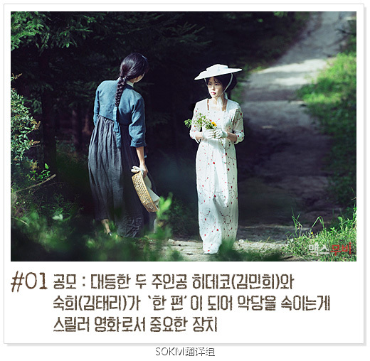 01 同谋:力量相均的两位主人公“秀子”(金敏喜 饰)和“淑熙”(金泰璃 饰)结盟成为“统一体”欺瞒恶党,成为惊悚元素的重要设定。