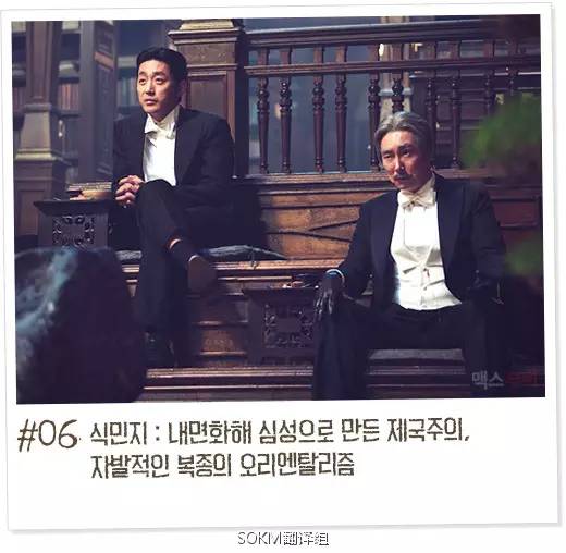 A:比如这栋豪宅的所有者上月(赵震雄)这个人,就是那个时代精神上彻底被殖民化的上层阶级知识分子的代表人物。从伯爵的说明中我们得知,朝鲜时代“中人”等级身份的翻译官“上月”,因为在韩日合并的过程中立了大功,所以在殖民地时期得到了身份等级的提升。“上月”并不是因为金钱或官职而亲日,而是“真的”喜欢日本,骨子里特别希望成为日本人。所以加入国籍都不够,还和日本女人结婚。所有价值取向上都认为朝鲜劣等,而日本优越。通过日本所接触的西方文化也是盲目崇拜,这正是自发性殖民本性的根源。劣等感、自卑感的不断展现,对日本和欧洲的盲目崇拜,呈现在视觉上便是“上月”所打造的豪宅,一座集合西洋式和日本式样的建筑。影片中半部,已经在伯爵面前曝露了身份的“上月”,在两人独处时明明可用韩语交流却还要掺杂日语,与近来知识分子混杂外语说话的姿态极为相像。那样的人到现在也是能轻松找到。