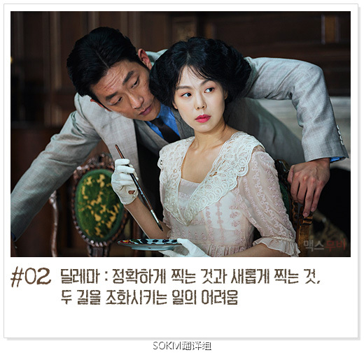 A:是的,喜欢不轻易向命运低头的人。感觉那样的女性好像更有风情。但有那样的女性所登场的电影几乎没有,我倒是挺想看,但总是不容易看到,所以我自己上阵也想多拍几部。另外我自己成不了那样凡是斗争的人,任何时候都是顺应,是个懦弱的小市民,所以电影中也想描写一下那样勇于斗争的人。《小姐》中与“上月”、“伯爵”两个展现殖民地劣根性和等级上升欲望的“恶党”相反,“秀子”、“淑熙”则不是对外物崇拜或是盲目追随的人。