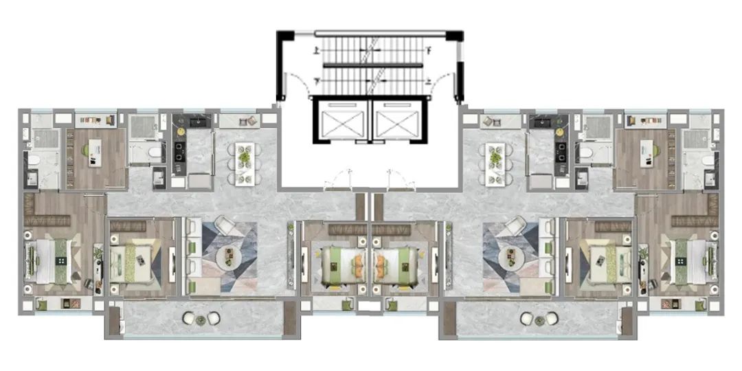 建面约168㎡四室两厅三卫:与建面约143㎡户型格局大致相同,不同的是除了面积更大外,此户型有三个卫生间,朝南的东西两侧的主卧和客卧均配备有独立的卫生间。
