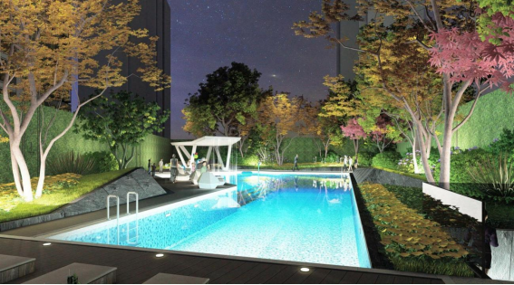 会所外部设有梦幻星光泳池,为炎炎盛夏带来一丝清凉惬意。建筑、星光、树影倒映池中,形成镜花水月般的奇妙意境,美不胜收。