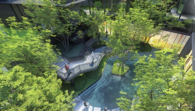 穿过阶梯,进入树影环绕的下沉式星光庭院,静水沉璧、树池点缀、汀步错落,水光熠熠、树影斑驳之间,营造出高低错落的诗意。