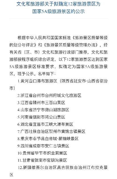 华龙网消息,日前,根据中华人民共和国国家标准《旅游景区质量等级的划分与评定》和《旅游景区质量等级管理办法》,经有关省(区、市)文化和旅游行政部门推荐,国家文化和旅游部按程序组织综合评定,共12家旅游景区达到国家5A级旅游景区标准要求,拟确定为国家5A级旅游景区。其中,重庆市奉节县白帝城·瞿塘峡景区上榜。