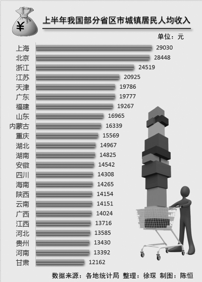 近日,中国各地2016年上半年居民收入数据陆续出炉。经不完全统计,截至目前,除了山西、宁夏、新疆、西藏及东三省外,其余省区市均已公布上半年居民收入数据。从已公布数据的地区看,上半年城镇居民收入增速位居前三位的依次是贵州(9.3%)、青海(9.2%)、天津(9.1%)三地,增速均超过9%;农村居民收入增速位居前三位的依次是重庆(11.3%)、贵州(10.5%)、广西(10.3%)三地,增速均超过10%。同时,至少有15个省区市上半年的城乡居民收入名义增速均高于全国平均值。