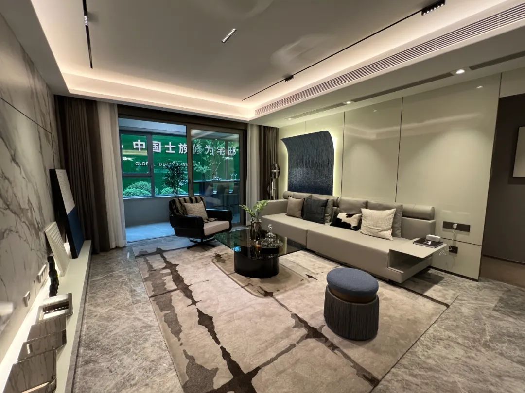 地面作为后期交付,采用了品质较高的天然石材,客厅的岩板、烤漆板背景墙均为交付标准,搭配有木饰面及金属包边。