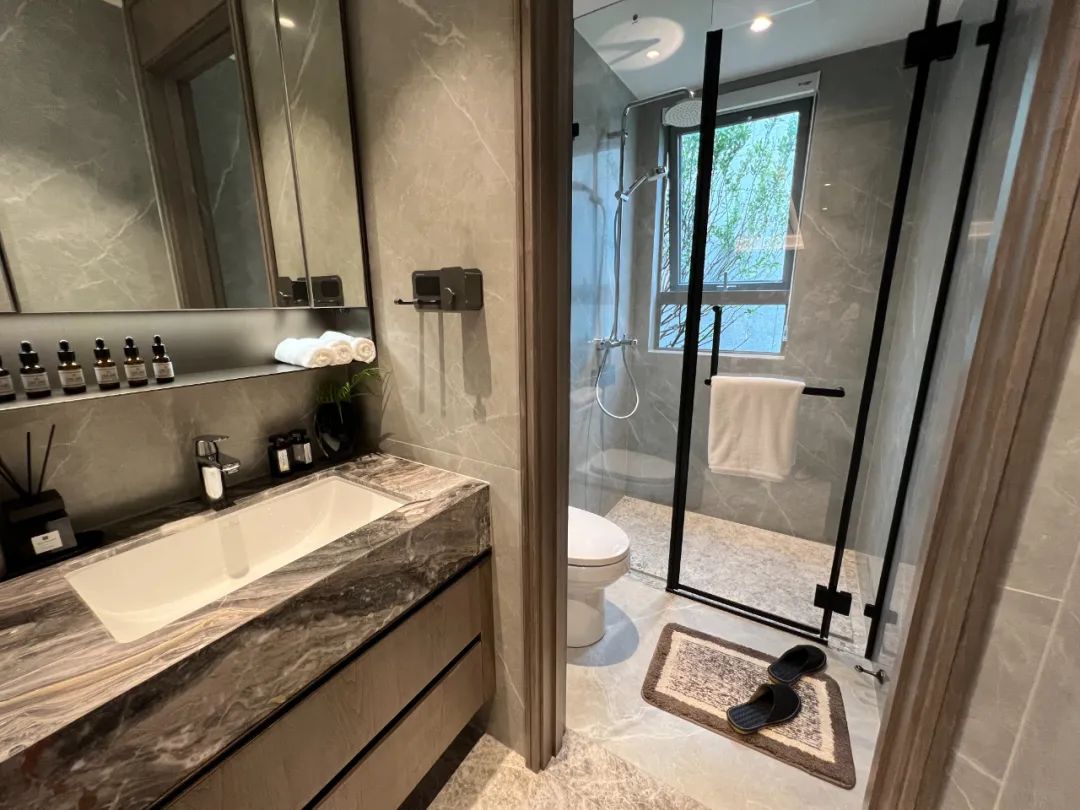 卫生间采用了干湿三分离设计,卫浴采用了高仪等一线品牌,还涉及了电热毛巾架。