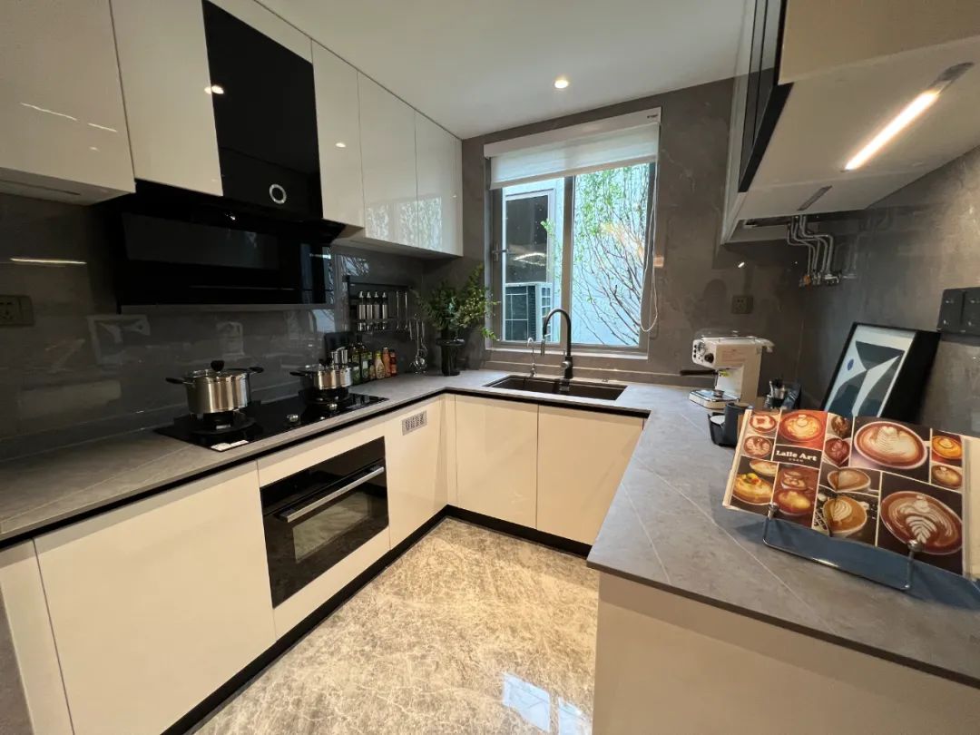 U型厨房设计,选用博世四件套(灶具、油烟机、洗碗机、蒸烤一体机),另外还配备了垃圾处理器、净水器、天使拉杆等。