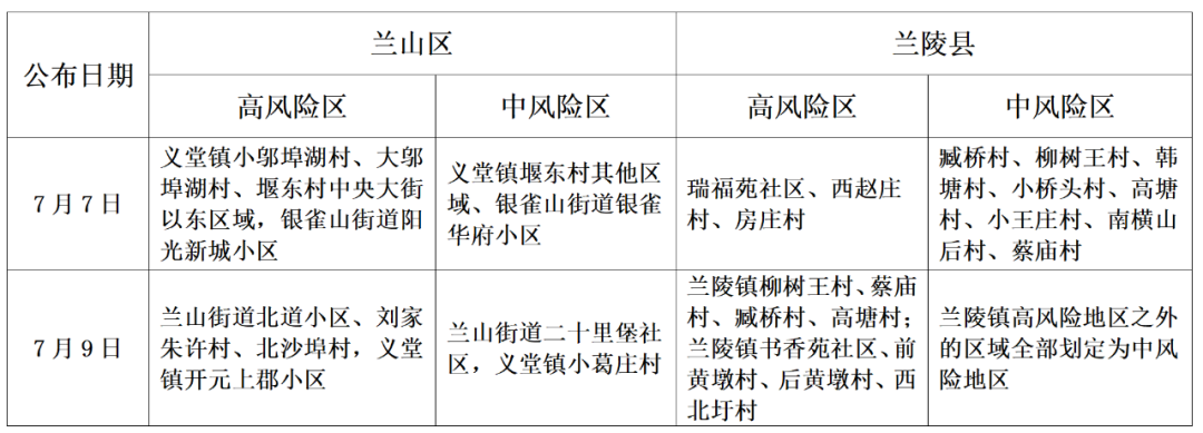 “健康临沂”微信公众号消息,临沂市委统筹疫情防控和经济运行工作领导小组(指挥部)消息,为快速有效阻断疫情传播扩散,切实保障辖区群众生命安全和身体健康,根据《新型冠状病毒肺炎防控方案(第九版)》规定,经专家组综合研判,自2022年7月9日起,兰陵县调整、新增以下区域为高风险区、中风险区,落实相应管控措施。现将相关事项通告如下: