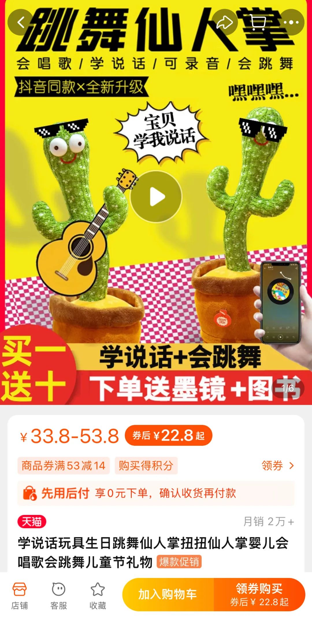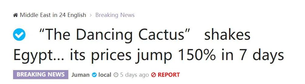 去年,“跳舞仙人掌”先后在抖音和海外版抖音TikTok上走红,在埃及更一跃成为市场上最畅销的玩具。据外媒报道,在短短一周内,“跳舞仙人掌”在埃及的价格暴涨150%,其中带有USB接口、能进行充电续航的智能款在埃及市场的售价在300~500英镑(约合人民币2400~4000元)之间,不可充电的普通款售价也要在135~165英镑(约合人民币1080~1320元)之间,然而在这种情况下,还是供不应求。