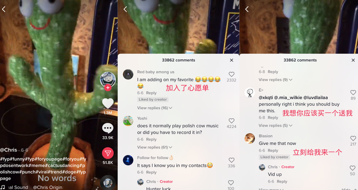 还有社交平台的助力。中国潮玩在海外走红离不开海外社交和视频平台的功劳,比如,“跳舞仙人掌”就在TikTok上火得一发不可收拾,在相关标签里,就有350多万的播放量;莲花生日灯更是引得海外网友频频打call。