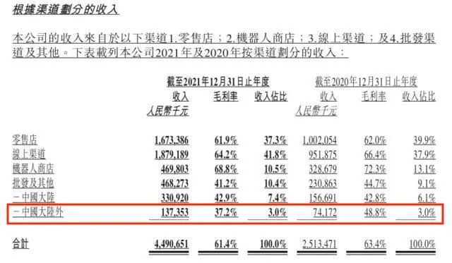 从2021年全年财报来看,泡泡玛特2021年营收44.9亿元,同比增长78.7%;调整后净利润10.02亿元,同比增长69.6%。其中,海外收入从2020年的7420万元,已增加到2021年的1.374亿元,同比增长了85.2%,增长势头强劲。