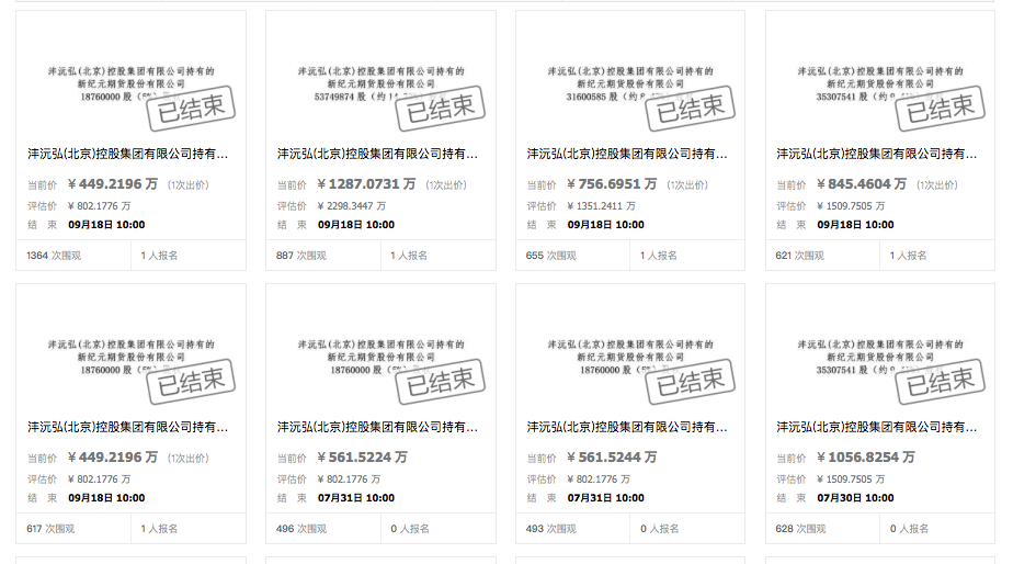 淘宝司法拍卖平台显示,2021年9月18日,徐州新彭城投成功竞得徐州市鼓楼区人民法院在该平台拍卖的5份标的,共计新纪元期货的42.16%股权,竞拍成功金额总计为3787.6678万元。也就是说,新纪元期货的公司估值约为8984万元。