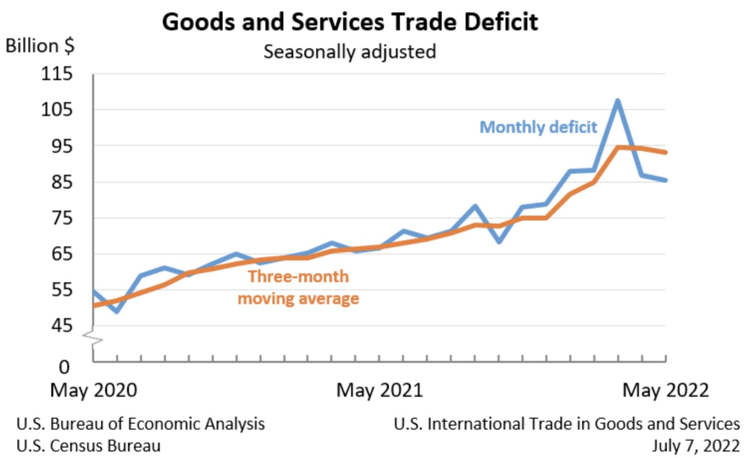 与德国类似,美国的进出口贸易在后疫情时代也快速恢复。美东时间7月7日,美国商务部经济分析局公布的国际贸易数据显示,5月美国进出口额分别为3414亿美元和2559亿美元,当月贸易赤字小幅回落至855亿美元。2022年前5个月美国的出口总额同比增长19.4%,但进口总额24%的同比增幅使得美国的贸易赤字较去年同期增加了38.4%(1265亿美元),逆差总额高达4613亿美元。