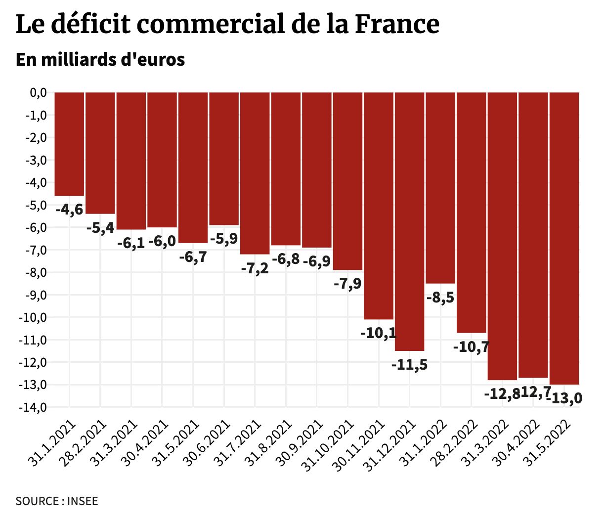仅以5月进出口数据为例,法国当月出口额与上月持平,达476亿欧元,但进口额仍然持续增长至607亿欧元。过去十二个月内,法国的贸易逆差已经累计高达1139亿欧元,同样刷新历史纪录。