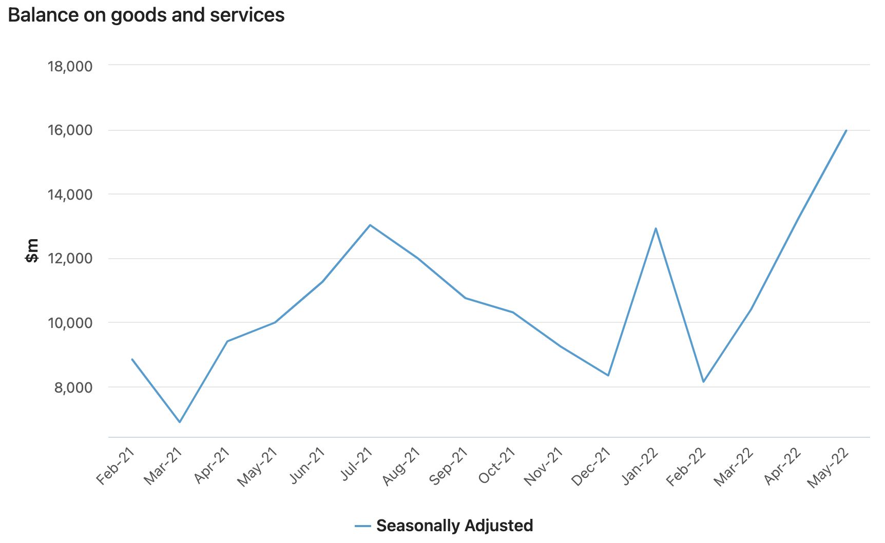 澳大利亚统计局7月7日公布的5月国际贸易数据显示,该月澳大利亚经季节性调整的贸易顺差达到159.7亿澳元,远超外界预期的108亿澳元并刷新历史纪录。受煤炭以及其他矿物燃料价格上涨的推动,5月出口额环比增长超过9.5%,其中仅煤炭一项的环比增幅就超过了两成。除了煤炭之外,澳大利亚还是铁矿石与液化天然气的出口大国。不过,由于铁矿石价格的回落,5月澳大利亚金属矿物的出口额环比增幅仅为2.8%。