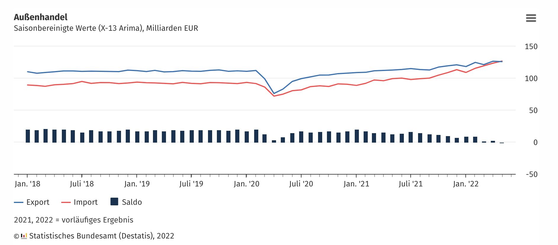 新冠疫情爆发之前,德国常年保持每月190亿至210亿欧元的贸易顺差,但自从去年第三季度以来便出现了失控的趋势。2021年7月,德国的月度贸易顺差仍能保持在171亿欧元,之后便一路下滑至今年3月的19亿欧元和4月的31亿欧元,距离出现贸易逆差仅有一线之隔。