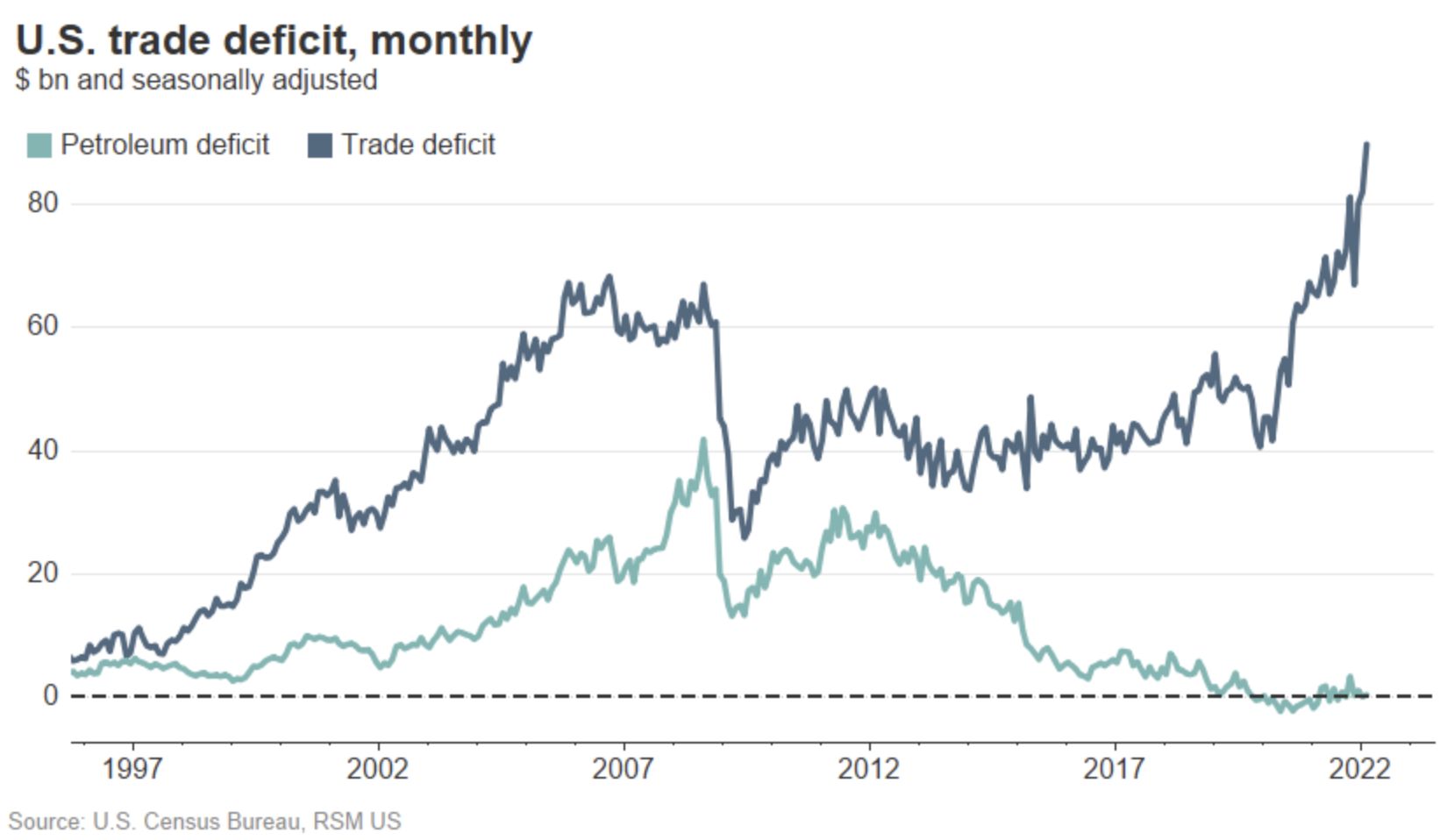 若以前5个月的贸易逆差均值推算,2022年全年的美国贸易逆差将超过11000亿美元,这也将是美国年度贸易逆差历史上首次突破万亿美元关口。2021年,美国贸易逆差为8591亿美元,较2020年的6767亿美元增长27%。