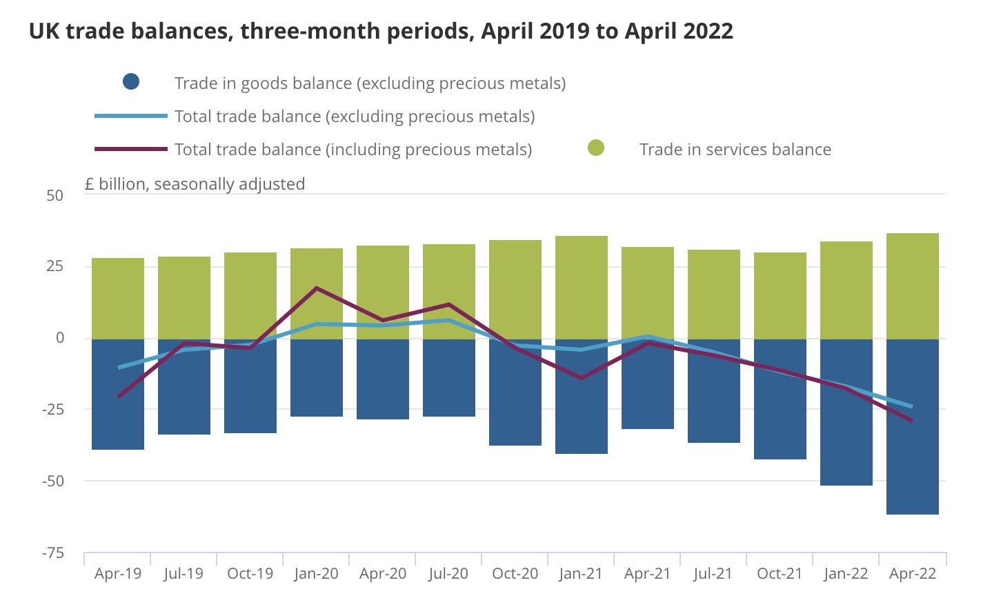 当前正饱受通胀、脱欧贸易冲突以及首相约翰逊辞职风波冲击的英国情况亦与法国类似。英国国家统计局早先的数据表明,1月至4月英国不含贵金属交易的贸易逆差达到206亿英镑,同样为近年来新高。