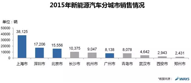 从2015年的销量数据可以看出,上海以3.8万余辆的零售量领跑新能源市场,比第二名的深圳翻了一番,北京、长沙、杭州、广州分列第4至6名。由于长沙消费主要集中在云100和知豆,产品较为单一,而杭州主要以租赁电动车康迪为主。除去两地,若仅选取北京、上海、广州、深圳四地的数据进行分析,其销量之和约占前10城市总销量的67.8%,可以表明新能源汽车的战场主要集中在北上广深四大城市。