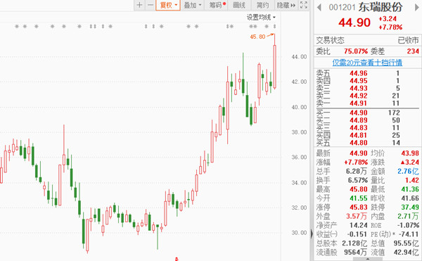 7月8日(周五),东瑞股份(001201.SZ)股价收于44.90元,涨7.78%,自5月30日以来其股价已经从30元附近涨至45元附近,区间涨幅达47.41%。