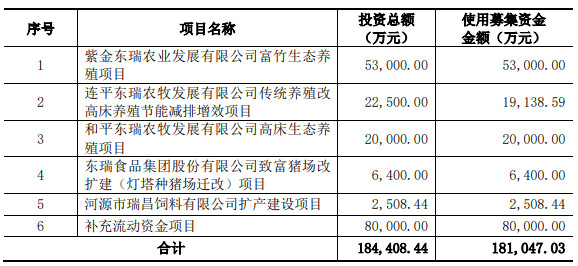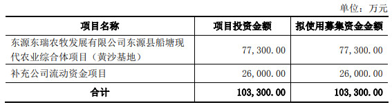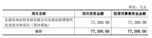 原发行预案拟募集总额不超过7.73亿元,扣除相关发行费用之后全部用于“东源东瑞农牧发展有限公司东源县船塘现代农业综合体项目(黄沙基地)”(简称“东源黄沙项目”)。该项目建成后,达产后可形成年出栏30万头商品猪的规模。