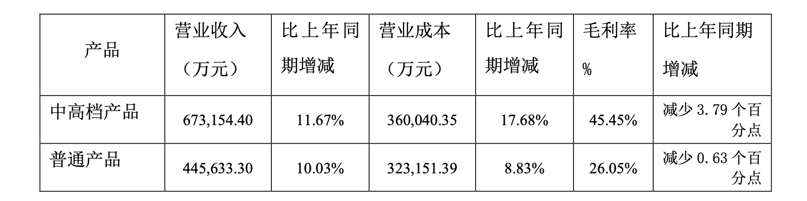 根据2021年年报显示,燕京啤酒去年中高端产品实现营收67.32亿元,同比增加11.67%。中高端产品营收提升的同时,盈利能力似乎却略有下降,根据公告显示,2021年燕京啤酒中高档产品毛利率为45.45%,同比减少3.79个百分点。