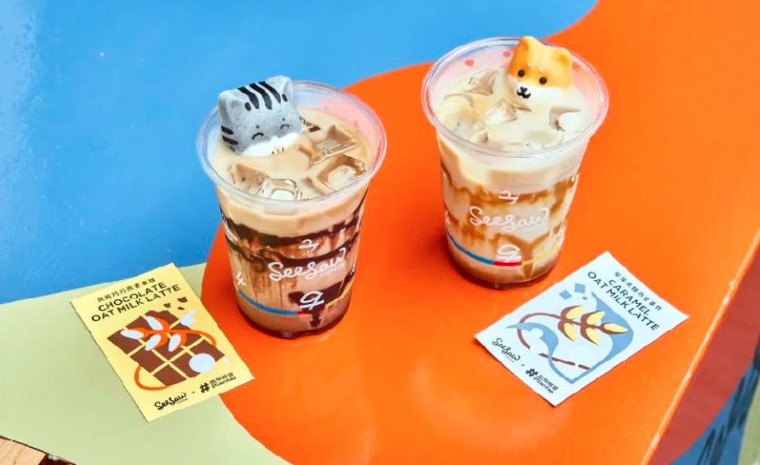 最近SeesawCoffee和植物标签发起了一个“全民小宝贝限定”的植物基咖啡活动,这里说的小宝贝指的是萌宠们,可爱的柴柴和虎斑等被做成了棉花糖,在咖啡里享受“泡泡浴”。如果你带上家里的毛茸茸宠物到Seesaw宠物主题店做游戏,并上传美美的照片到社交平台,便可免费获得活动周边(萌宠杯和萌宠碗)。