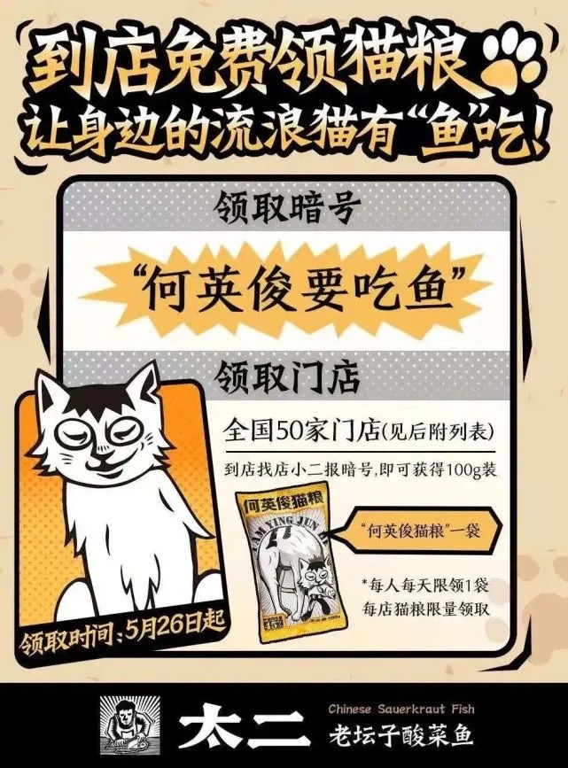 抓住“它经济”的太二酸菜鱼,则是在去年搞了一个送猫粮的活动,称是在北上广深、厦门、西安、杭州、南京8个城市的50家门店,消费者只要到店与店小二说出暗号,无需消费,即可免费领一袋猫粮。这个活动源于城市里的流浪猫越来越多,遭受到饥饿、车祸等现象不计其数,借此倡导大家关注流浪动物,不要轻易饲养,更不要随意遗弃。此外,出于自身“卖鱼”的品牌属性,太二还推出了一个名为“何英俊”的流浪猫形象。