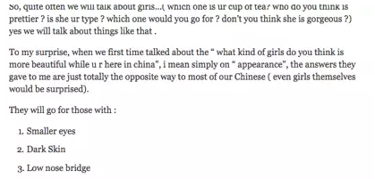 一位外国网友更是坦言,自己和朋友生活在中国,有时候他们会坐在露天咖啡厅,看街上的女孩。大家一致想找要的是:小眼睛、深色皮肤、矮鼻梁。完全达标中国眼中的“丑女”形象。。