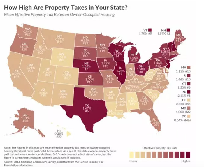 一家企业通常有一定数量的不动产,因此,房产税也是企业税负的重要组成部分。全美各州平均征收的住宅房产税率(房产税占其政府评估的市场价值百分比)各州排名如上图所示,颜色越深代表税率越高。商业地产比住宅低产的税率略高。