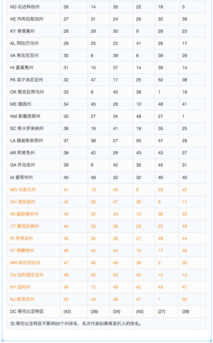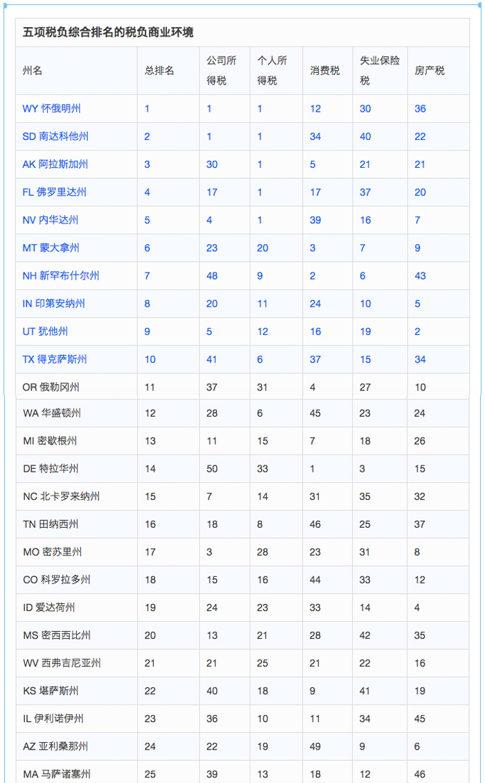 综合前四项各州税率政策,以及企业需要承担的对其近期失业员工的失业保险税税率的影响,可得出一个各州企业税收负担的综合评价,请见上图。蓝色的十个州代表该州的商业税率相对较低,而橙色的十个州的商业税率相对较高。具体所有州的五项税负及总综合评价排名请见下表: