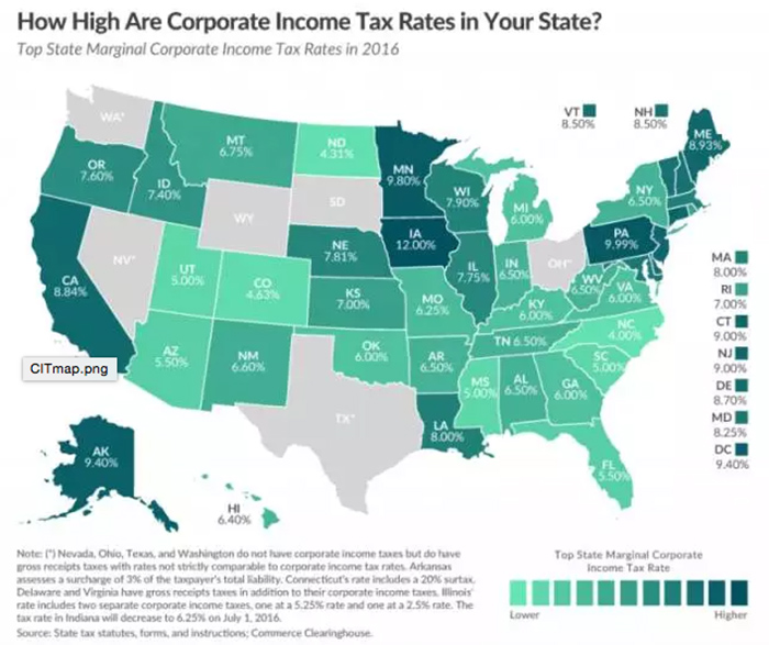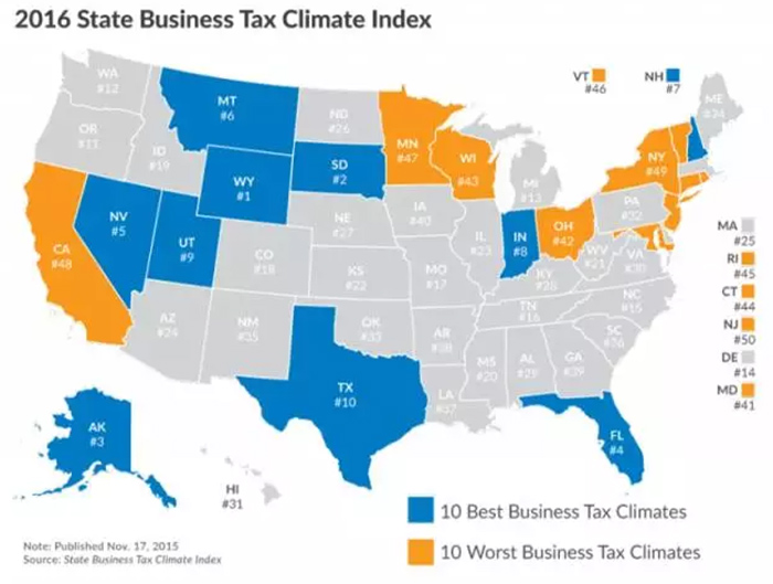 美国各州为了吸引投资,对于企业在各方面税务进行综合考量制定政策,大家在移民前后考虑在美国创建或投资已有企业时,需要关心各地相关的税务政策,从而选择合理的投资地及运用各州特定的优惠政策来降低税负成本。今天,外联税务团队就先给大家分享各州的基本商业税收。